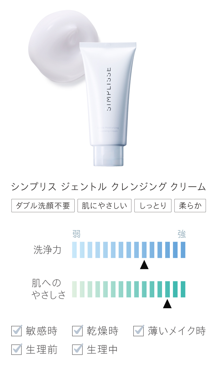 クリームを肌の上に優しく滑らせるだけで、するすると簡単にメイクが落ちていくので驚きました。洗い上がりの肌も柔らかくほぐれたような触り心地で、その後に使った美容液も、いつもよりしっかり浸透しているような感覚がありました。シンプリスの爽やかな香りも相まって、とても気持ちのいい使用感でした。