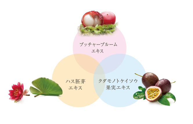 *クダモノトケイソウ果実エキス、ブッチャーブルームエキス、ハス胚芽エキス