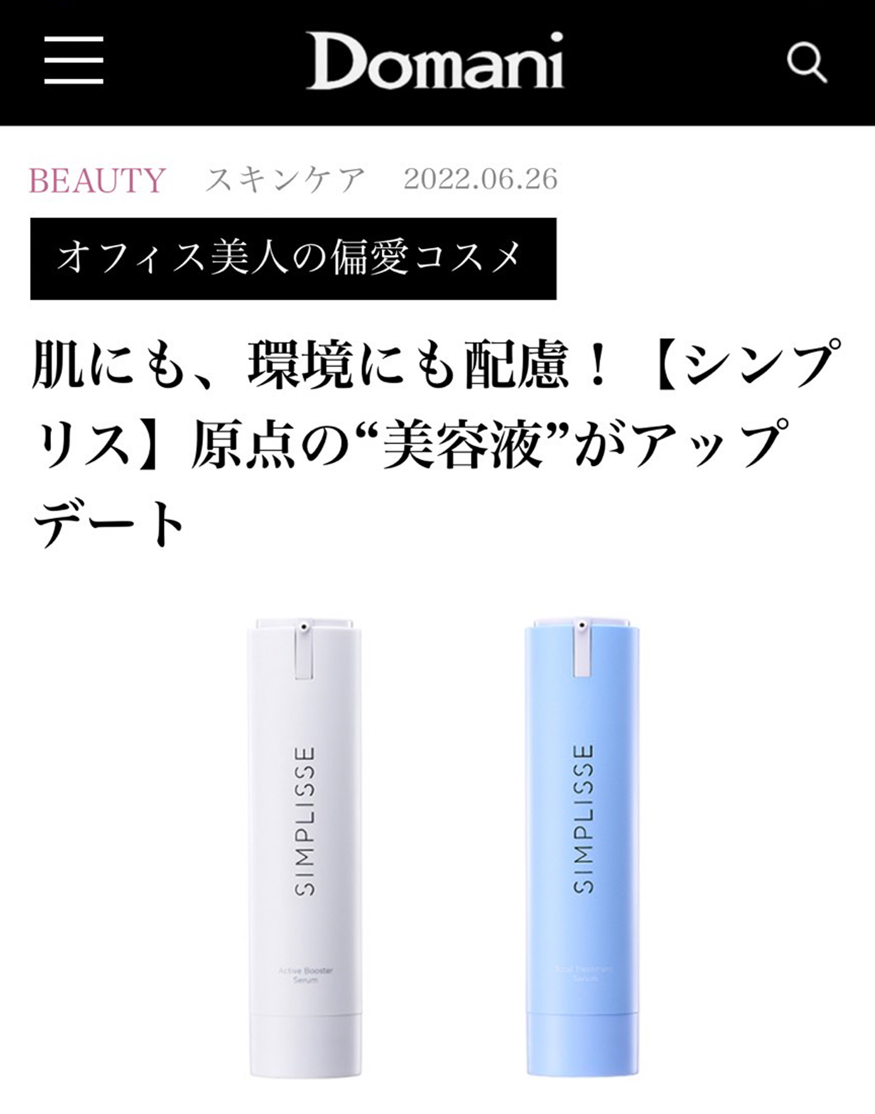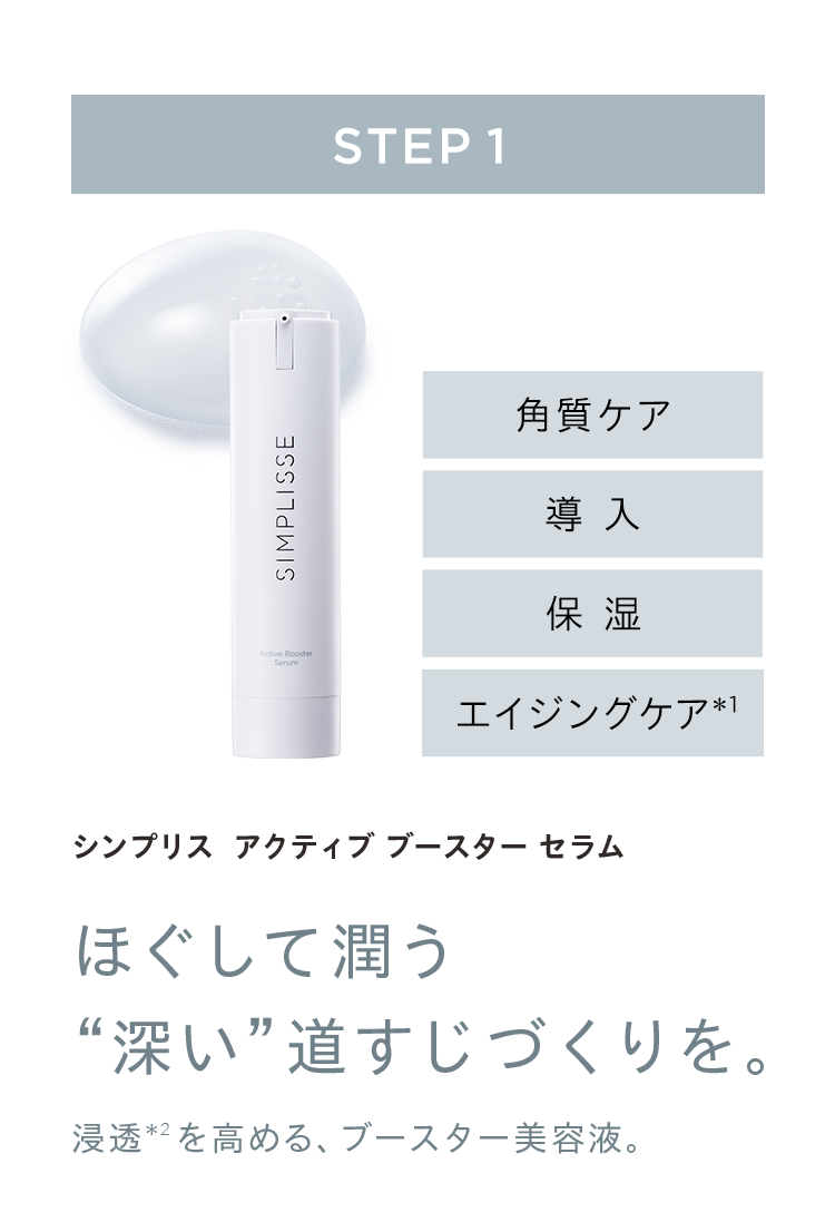 HOME OUTER CARE この商品に関する問い合わせ 角質ケアから保湿、エイジングケア(*1)までを2本で完成。 手応えにも、使い心地の良さにもこだわり、大人の欲しいを詰め込んだ理想に導く贅沢な美容液です。 皮膚科学に基づく理論から辿り着いたシンプルで確実な2ステップで、肌に必要なものをきちんと届けます。 *1 年齢に応じたお手入れのこと ※レフィルセット美容液2本で、自信の素肌へ。 シンプリス 2ステップ 美容液セット<レフィル> ・シンプリス アクティブ ブースター セラム <美容液> 50g(朝夜約45日分) レフィル 税込 7,150円 ・シンプリス トータル トリートメント セラム <美容液> 48g(朝夜約45日分) レフィル 税込 7,150円 単品合計より1,320円お得なスペシャルセット ★★★★★ レビューを見る(件) 税込¥12,980円 通常購入する ツイート お気に入りの登録人数:7人 この商品をお気に入りに追加する 注文数: 会員ランクについて お支払い方法について 返品交換について 定期便について 本体セットのご購入はこちら シンプリス 2ステップ 美容液セット セット価格 税込 13,530円 定期初回 税込 6,765円 商品ページをみる レフィル単品のご購入はこちら シンプリス アクティブ ブースター セラム レフィル 通常価格 税込 7,150円 商品ページをみる レフィル単品のご購入はこちら シンプリス トータル トリートメント セラム レフィル 通常価格 税込 7,150円 商品ページをみる はじめての方へ お試しセットはこちら 【5日間お試し】2ステップ 美容液 トライアル 通常価格 税込 2,200円 商品ページをみる 角質ケアから保湿、エイジングケア(*1)までを2本で完成。 手応えにも、使い心地の良さにもこだわり、大人の欲しいを詰め込んだ理想に導く贅沢な美容液です。 皮膚科学に基づく理論から辿り着いたシンプルで確実な2ステップで、肌に必要なものをきちんと届けます。 *1 年齢に応じたお手入れのこと お気に入り一覧 表示名1 表示名2 表示名3 在庫状況 在庫数量:0 カートに入れる 商品説明 レビュー メディア掲載 必要なものを、惜しみなく。美容液だから叶う、シンプルで確かなケア。 SIMPLISSEによるケアは、2本の美容液。 皮膚科学に基づく理論から辿り着いた シンプルで確実な2ステップで、 肌に必要なものをきちんと届けます。 角質ケアから保湿、エイジングケア*1までを2本で完成。 手応えにも、使い心地の良さにもこだわり、 大人の欲しいを詰め込んだ 理想に導く贅沢な美容液です。 化粧水でもクリームでもない、美容液だからこそ、 あらゆる成分が効率的に、確かな実感に。 もう、肌に悩むのはおしまいにしましょう。 SIMPLISSEなら、それが可能です。 美容液だから、2 STEPなのにこんなに多角的アプローチ。 美容液の粒子は化粧水やクリーム、乳液よりも細かく設計することができます。 さらに、美容成分はどの基礎化粧品よりもたっぷり高濃度に配合可能。 美容液でケアすることが、理想の肌への一番の近道になるのです。 角質ケアのための2つのAHA(フルーツ酸)*3をダブル配合。 肌を柔らかくほぐして美容成分の浸透*2をサポート。 役割の違うヒアルロン酸、ヒト型セラミドを贅沢配合。肌のすみずみまで潤いを届けるから、次に使う美容成分を受け入れる準備を万端に。 水溶性・油溶性両方のフラーレンを贅沢配合。 注目成分ナイアシンアミドに合わせ、ビタミンC誘導体も配合。潤いあふれる透明肌へとサポート。 きゅっと整った印象へ。注目成分ペプチドとエーデルワイスエキス、アーチチョーク葉エキスなどをブレンド。 角質層から肌表面まで潤すから。クリームもいらない保湿力。 *1 エイジングケア成分/年齢に応じたお手入れのこと *2 角質層まで *3 グリコール酸+乳酸桿菌/セイヨウナシ果汁発酵液(角質ケア成分) *4 保湿成分 *5 肌が潤うことによる Aroma こだわりの香りでマインドフルネスな時間を。 グレープフルーツ・オレンジ・ゼラニウム・ラベンダーの天然精油をブレンドした、深呼吸したくなるような心安らぐ香り。 美容液2本に共通するSIMPLISSE独自の香りです。 シンプルで心地よく。SIMPLISSEのこだわり 空気に触れさせないエアレスボトル 美容液に空気が入らない特殊なエアレスボトルを採用。出した美容液がボトルへ逆戻りすることもないから、中身は酸化することなくいつもフレッシュ。 最後の1プッシュまで実感につなげたいからこそ、容器にもこだわります。 レフィル化で環境にやさしく 外容器を継続して使用できるレフィルを採用することで廃棄するプラスチック量を大幅に削減できます。 レフィルつけかえ方法はこちら ご使用方法 朝と夜、適量(2?4プッシュ)を顔全体、首、デコルテに均一に伸ばしてお使いください。 <ご使用順> (1)アクティブ ブースター セラム → (2)トータル トリートメント セラムの順にご使用ください。 【使用上の注意】 1.お肌に異常が生じていないかよく注意して使用してください。化粧品がお肌に合わないとき即ち次のような場合には、使用を中止してください。そのま