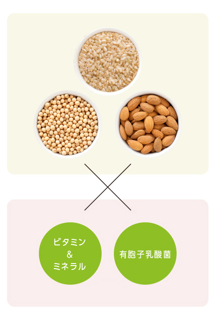 必須のたんぱく原料として「大豆」「アーモンドミルク」「玄米」の3種の植物性プロテイン をブレンド。