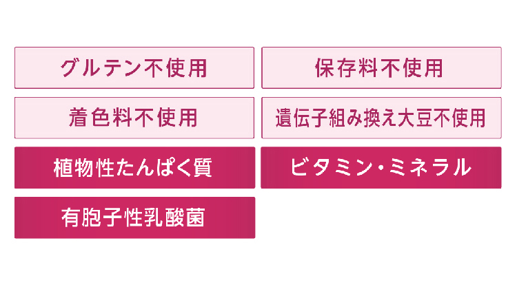 大豆たんぱく(国内製造)、羅漢果エキス末(羅漢果エキス、デキストリン)、玄米たんぱく、アーモンドパウダー、エリスリトール、酵母(亜鉛含有)、殺菌乳酸菌末、ビタミンE含有植物油、有胞子性乳酸菌末、乳酸菌混合末/香料、ビタミンC、貝カルシウム、ナイアシン、乳酸Ca、レシチン、塩化Mg、パントテン酸Ca、ピロリン酸第二鉄、ヘム鉄、V.B6、V.B2、V.B1、V.A、葉酸、V.D、V.B12 (一部に乳成分・大豆・アーモンドを含む)