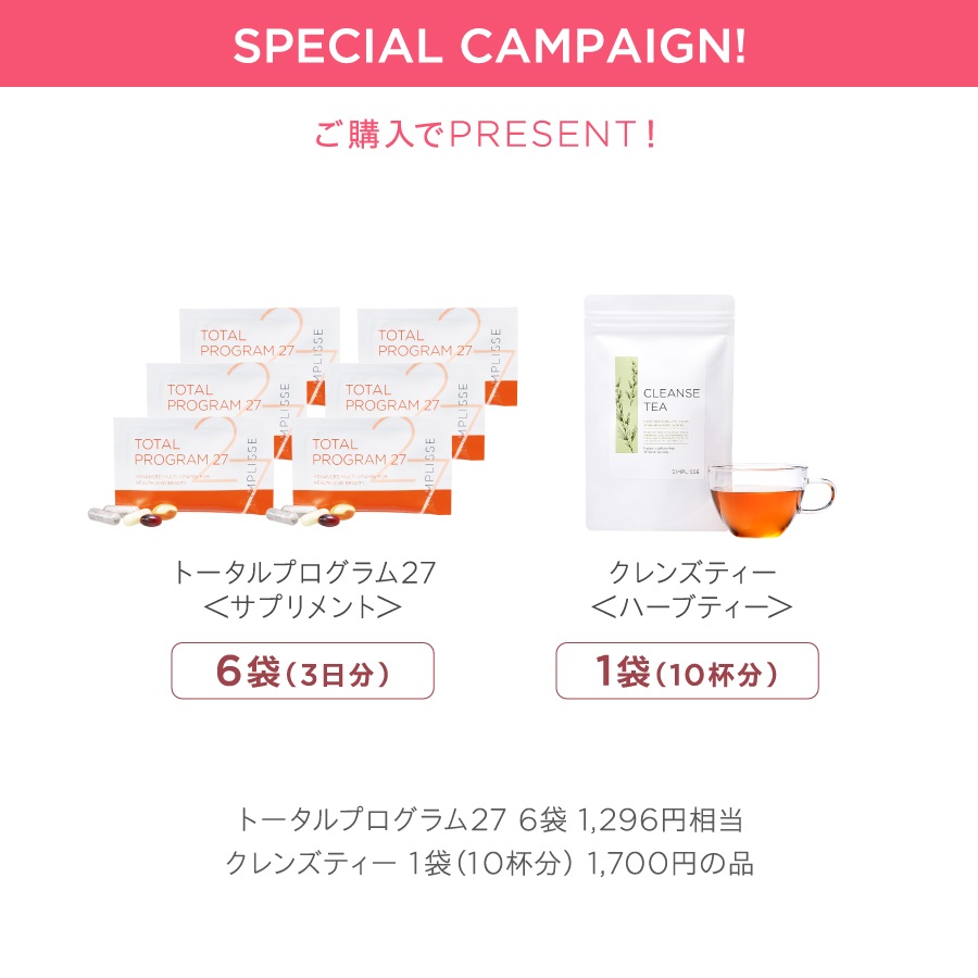 ・ご購入の方にトータルプログラム27 6袋+クレンズティー1袋をPRESENT!