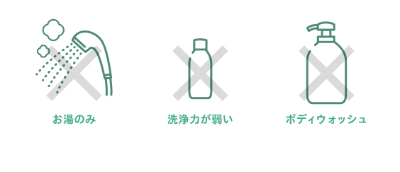 お湯で洗い流すだけ・弱酸性の洗浄力が弱すぎるもので洗っているだけでは、
