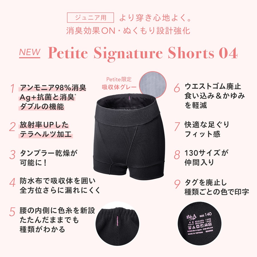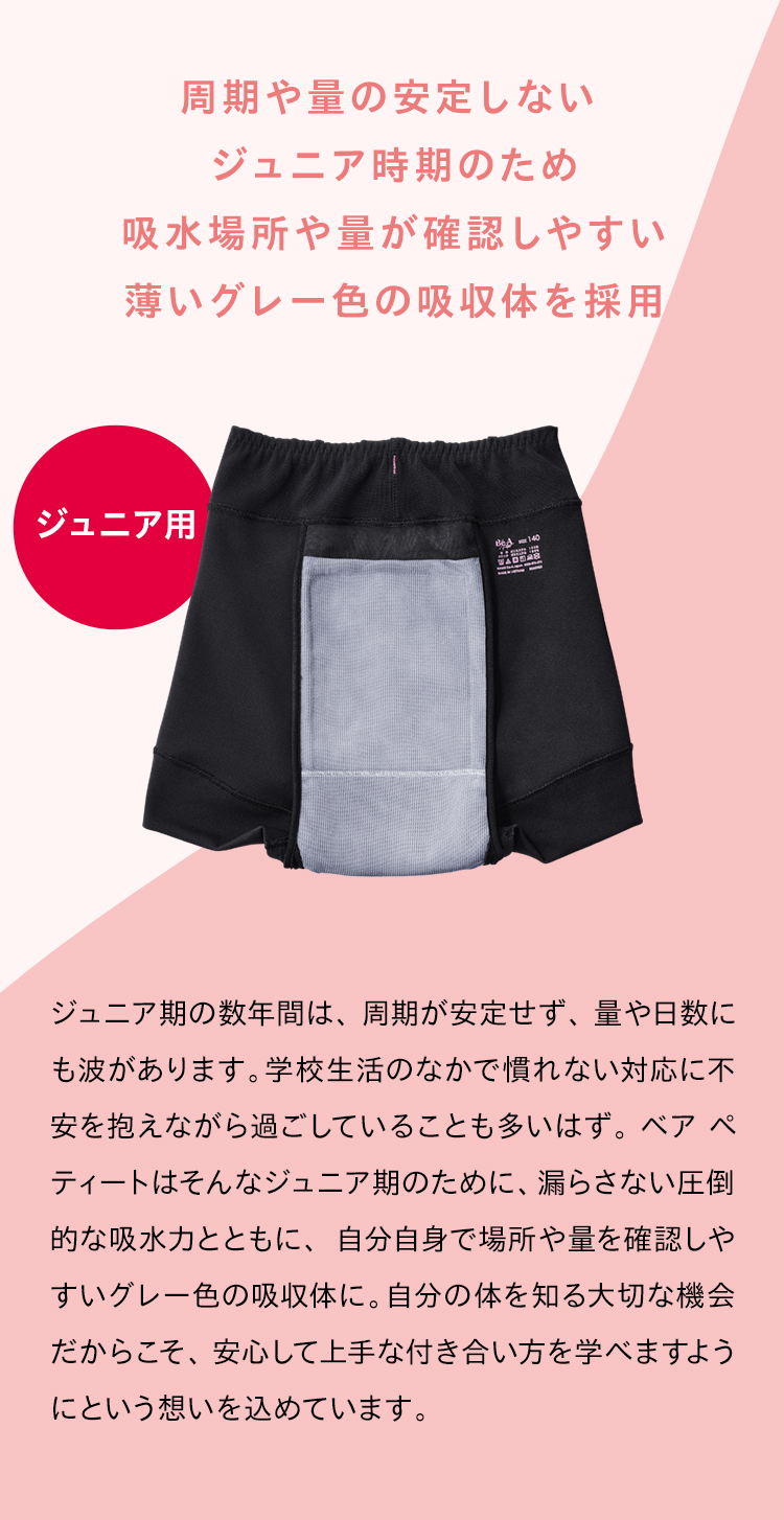 ジュニア用のペティート シグネチャー ショーツ 04は、自分自身で場所や量を確認しやすいグレー色の吸収体。
