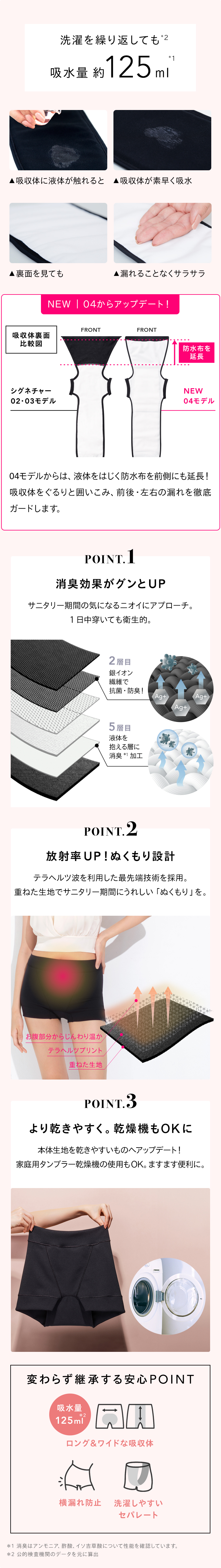 多い日の平均が約30-50mlといわれるのに対して、ベア ペティート シグネチャー ショーツ 04は約125ml *2の液体をすばやく吸収します。