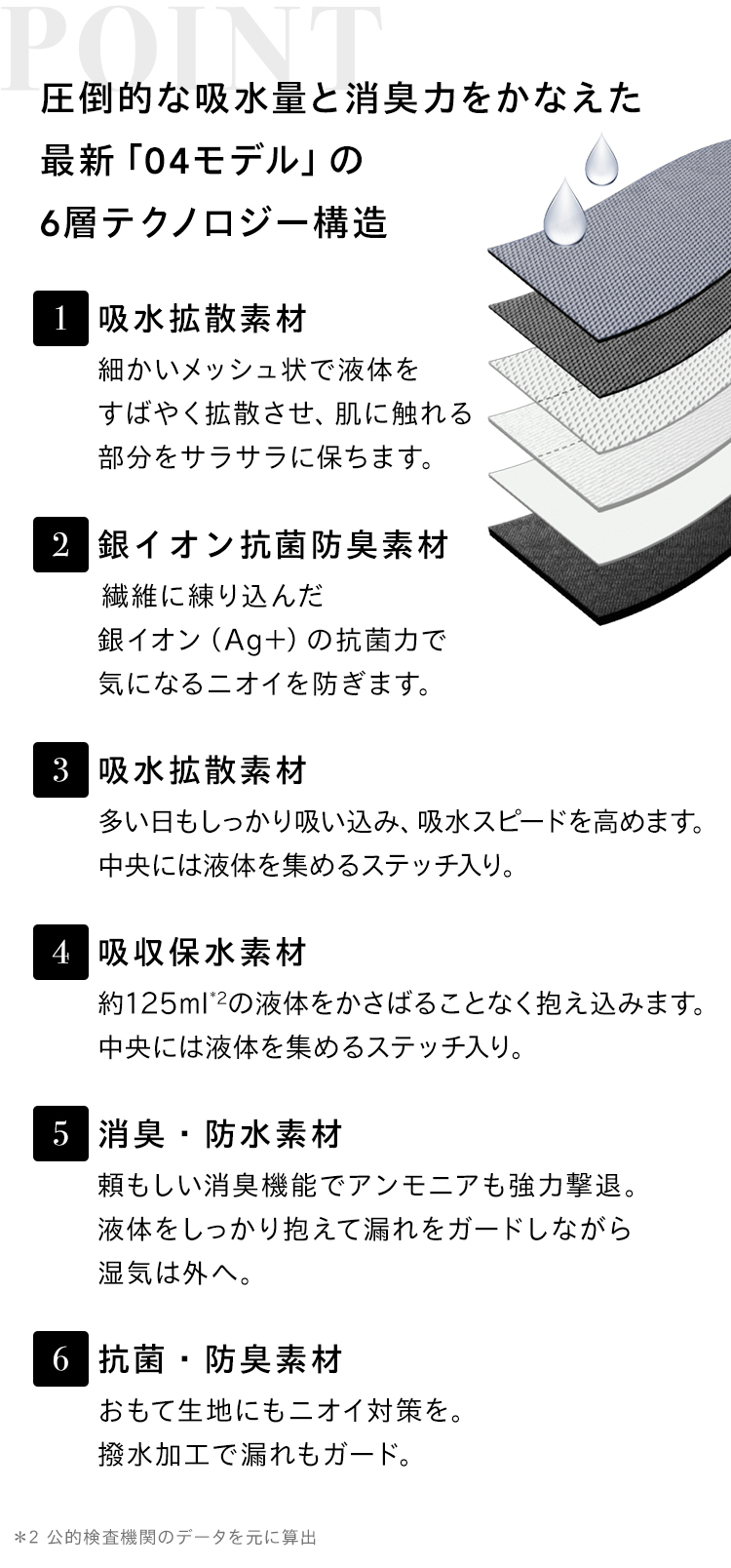 6層のテクノロジー構造で、約125ml*もの液体をしっかり吸水。