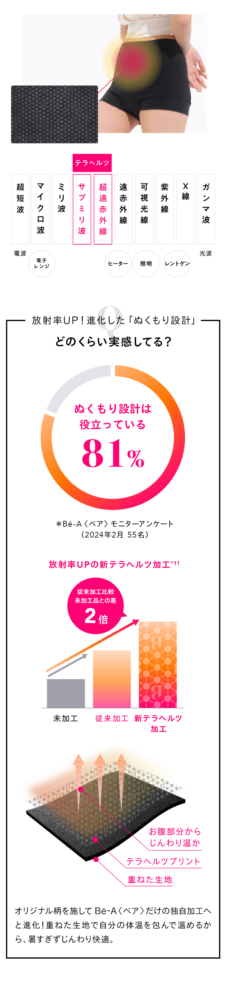 1秒間に1兆回振動する電磁波「テラヘルツ波」を放出する鉱石をパウダー化し、お腹に触れる生地へプリント。
