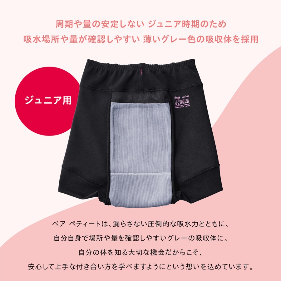 Be-Aは生理用品ではありません。日本において生理用品は、肌に当てる部分が白い不織布等で作られている使い捨て紙ナプキンを基準に、医薬部外品として指定されています。 ベア シグネチャー ショーツは、快適なサニタリーライフをサポートする吸水ショーツです。
