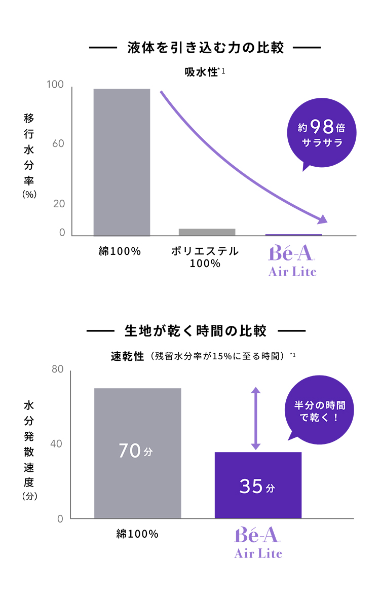 また、綿100%の生地に比ベて約半分の時間で乾くため、「蒸れ」を減らしてショーツの内側をドライに保ちます。