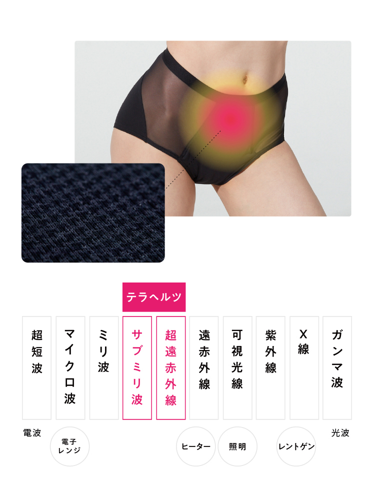 1秒間に1兆回振動する電磁波「テラヘルツ波」を放出するテラヘルツ鉱石をパウダー化し、お腹部分に触れる生地へプリント。