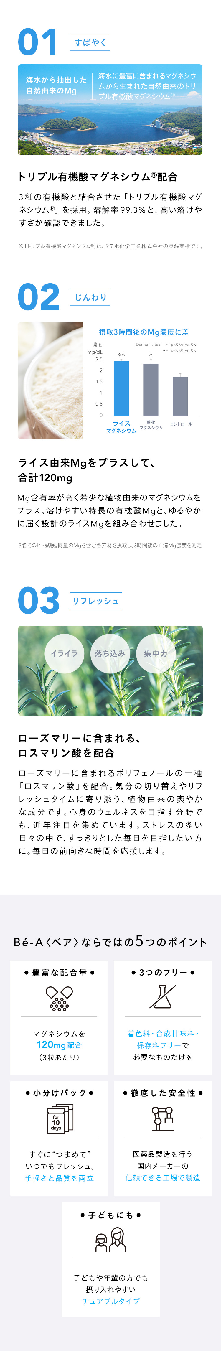 医師監修のもと、ストレスの多い日々に不足しがちなマグネシウムを、吸収性にすぐれたトリプル有機酸マグネシウム®と、植物由来のライスマグネシウムでチャージ。ローズマリーエキスも加え、すっきりとした毎日をサポートします。