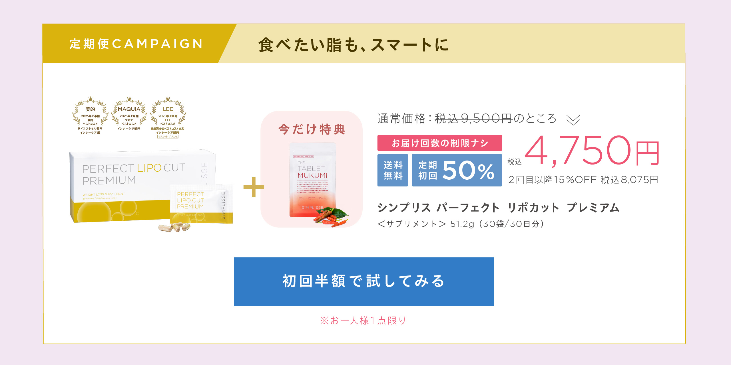 HOME SIMPLISSE DIET CAMPAIGN ・ 会員の方は、さらに会員割引が適用されます。 ・ 各種クーポンをお使いいただけます。 ・ 在庫などの状況により予告なくキャンペーンを終了させていただく場合がございます。 リポサンウルトラ™の実力を動画でチェック HOME SIMPLISSE DIET CAMPAIGN