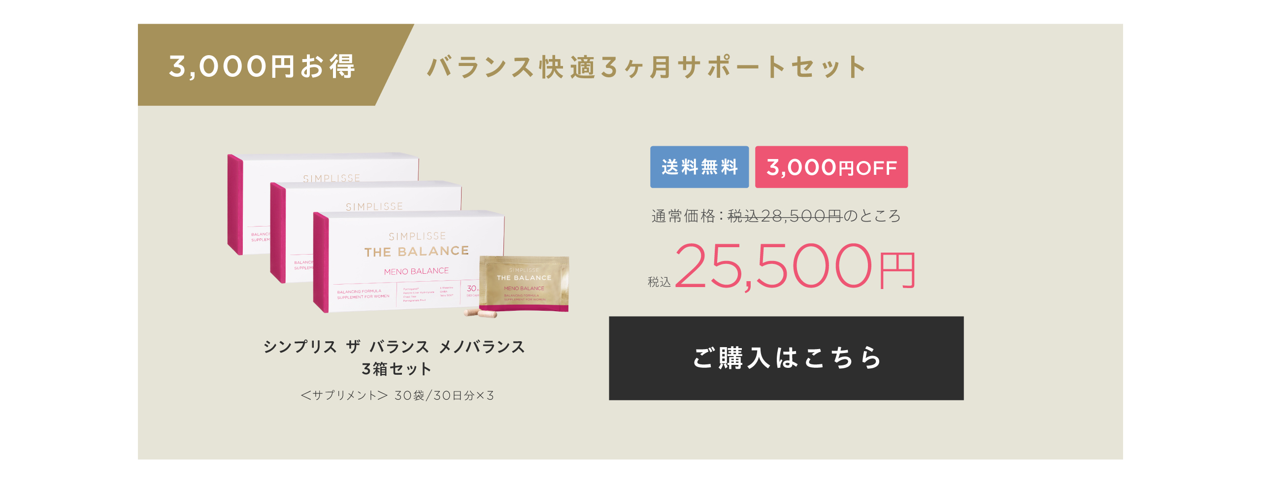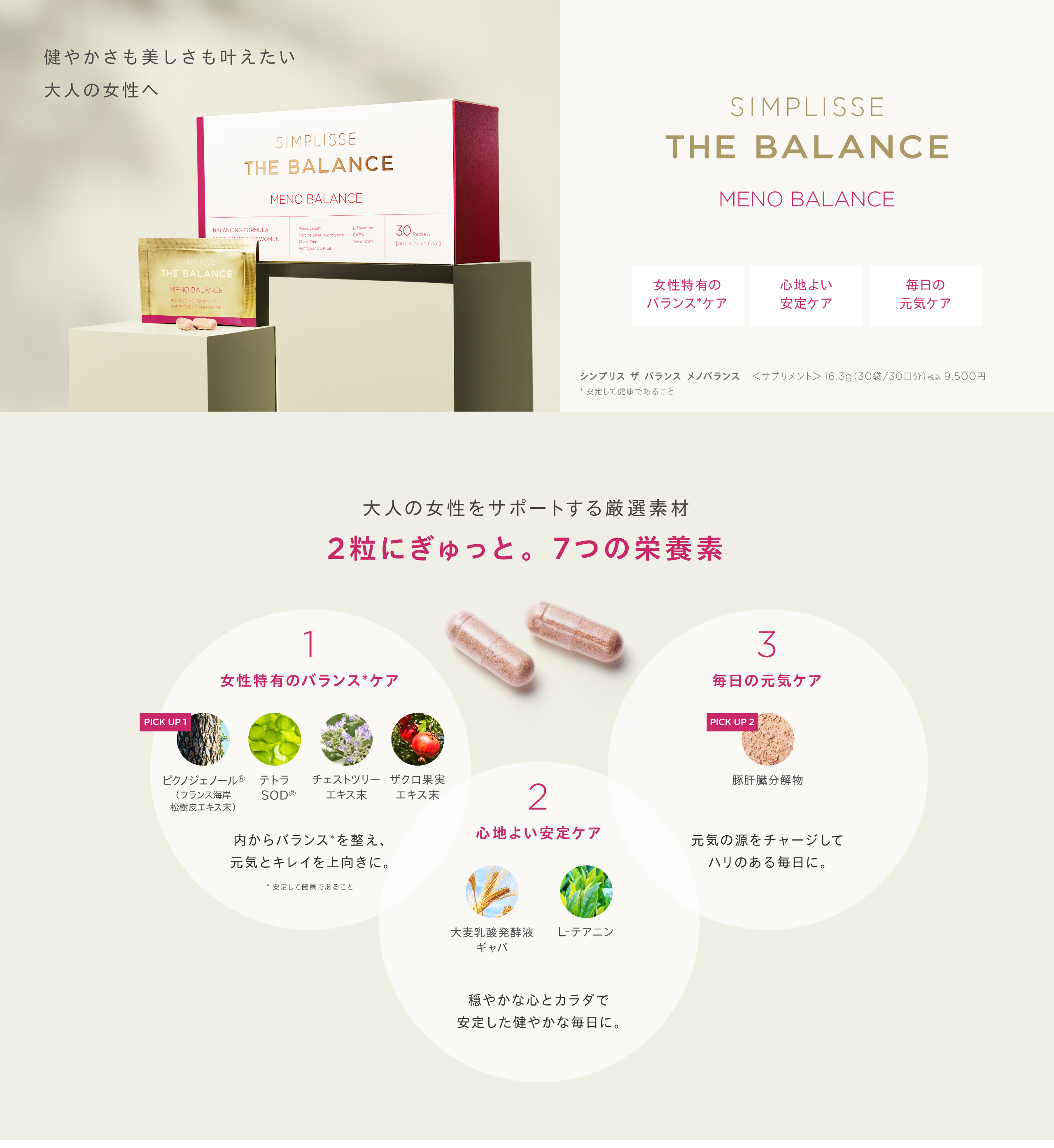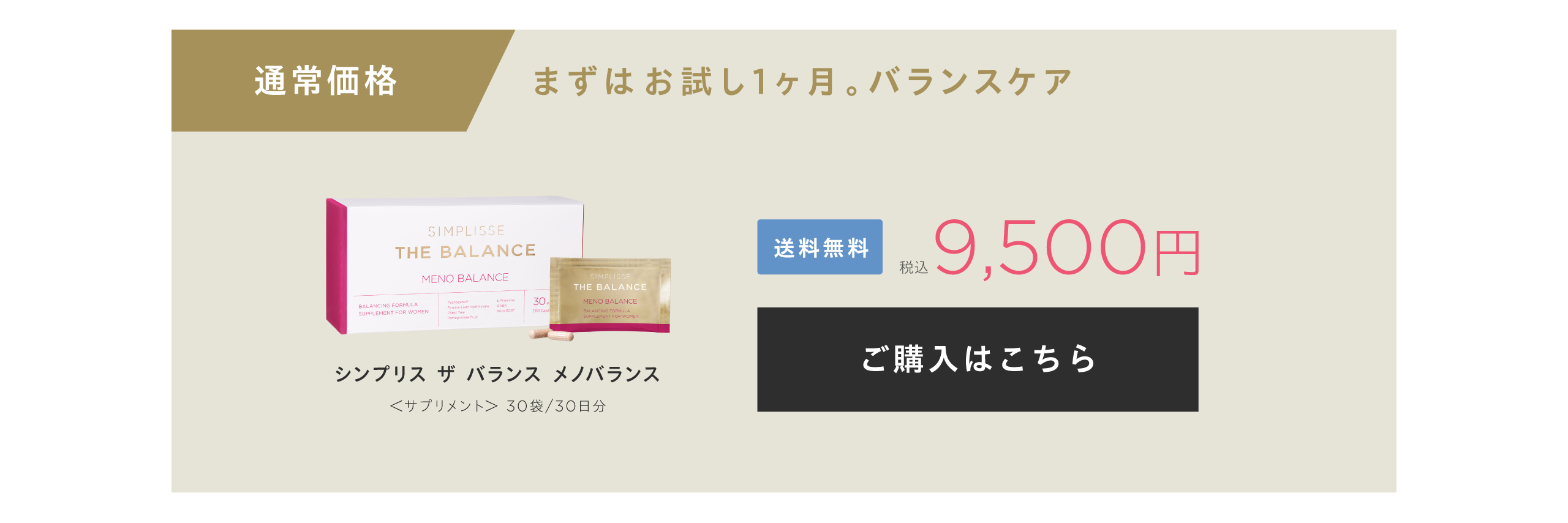 HOME SIMPLISSE THE BALANCE ・ 会員の方は、さらに会員割引が適用されます。 ・ 各種クーポンをお使いいただけます。 ・限定クーポンは会員登録後、ログインすると付与されます。 ・ 在庫などの状況により予告なくキャンペーンを終了させていただく場合がございます。 SIMPLISSE THE BALANCELINEUP MENO BALANCE メノバランス 初回50%OFF 通常価格 税込9,500円 税込4,750円 2回目以降 税込8,075円(15%OFF) 定期便はこちら 3回以上のお受け取りが条件となる商品です 単品価格 税込9,500円 通常購入はこちら セット価格 通常価格 税込税込28,500円 税込25,500円(1箱あたり 8,500円) 通常購入はこちら GOOD NIGHT SLEEP DRINK グッドナイト スリープ ドリンク 初回50%OFF 通常価格 税込9,600円 税込4,800円(1箱あたり 2,400円) 2回目以降 税込8,160円(15%OFF) 定期便はこちら 3回以上のお受け取りが条件となる商品です セット価格 通常価格 税込14,400円 税込12,600円(1箱あたり 4,200円) 通常購入はこちら セット価格 通常価格 税込9,600円 税込8,600円(1箱あたり 4,300円) 通常購入はこちら 単品価格 税込4,800円 通常購入はこちら THE BALANCE SET バランスセット セット価格 通常価格 税込14,300円 税込12,800円 通常購入はこちら ・ 会員の方は、さらに会員割引が適用されます。 ・ 各種クーポンをお使いいただけます。 HOME SIMPLISSE THE BALANCE