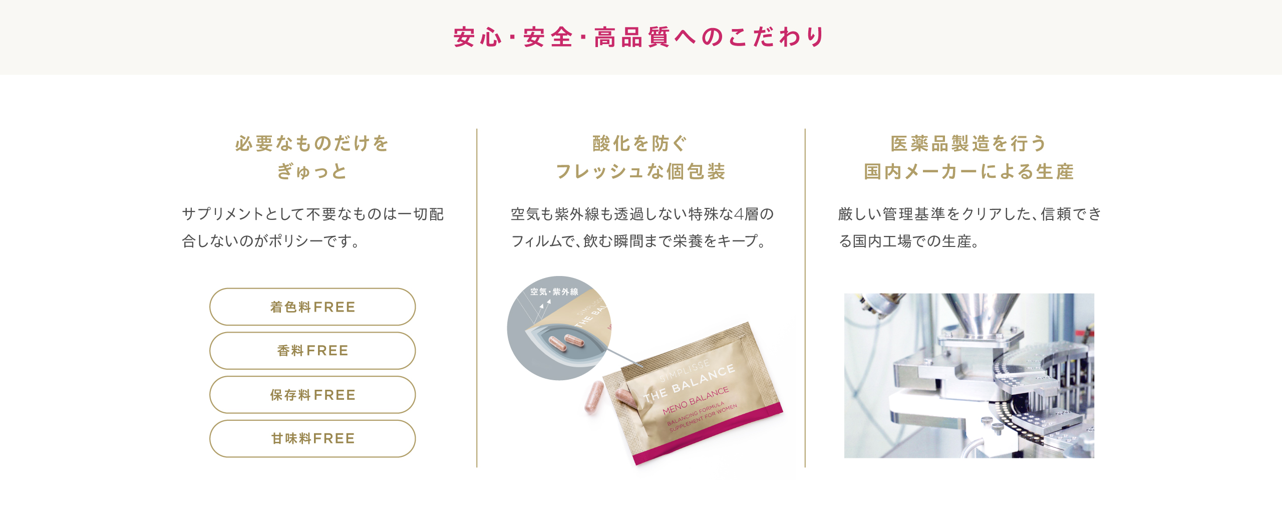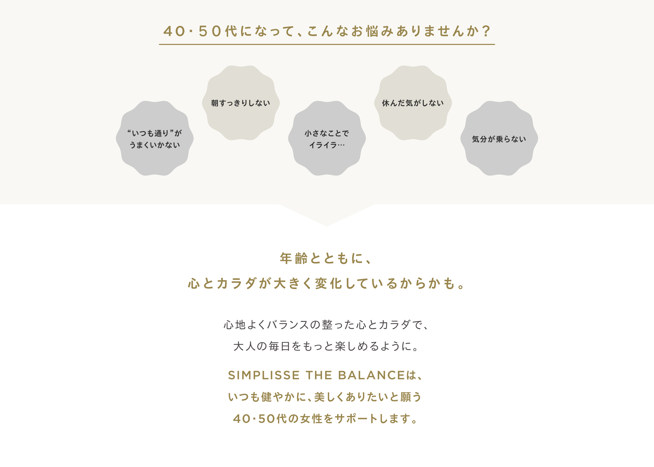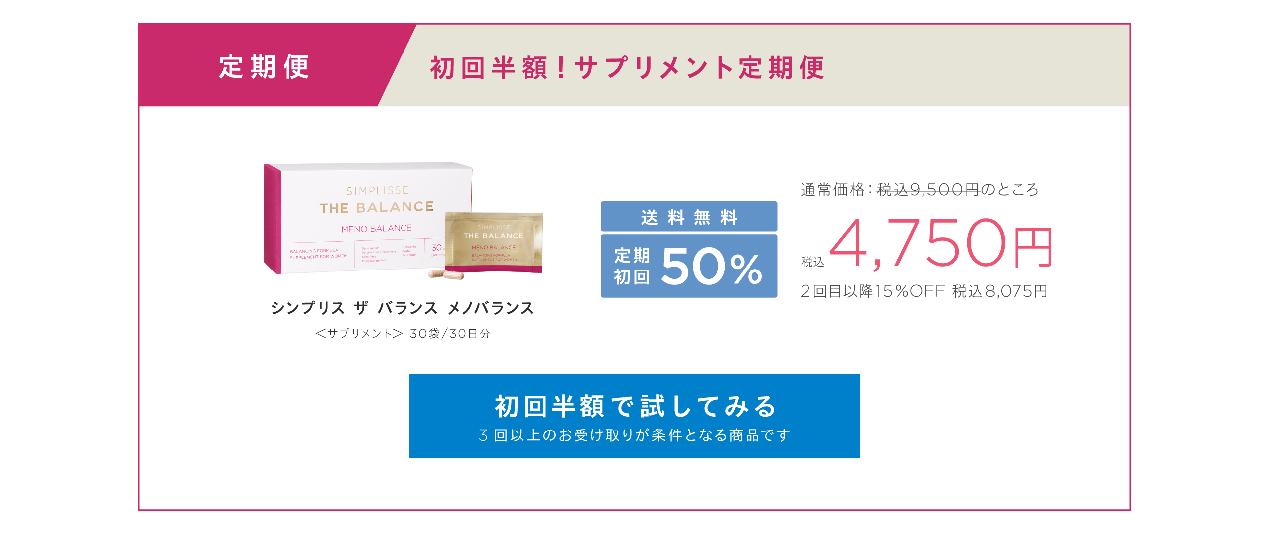 HOME SIMPLISSE THE BALANCE ・ 会員の方は、さらに会員割引が適用されます。 ・ 各種クーポンをお使いいただけます。 ・限定クーポンは会員登録後、ログインすると付与されます。 ・ 在庫などの状況により予告なくキャンペーンを終了させていただく場合がございます。 SIMPLISSE THE BALANCELINEUP MENO BALANCE メノバランス 初回50%OFF 通常価格 税込9,500円 税込4,750円 2回目以降 税込8,075円(15%OFF) 定期便はこちら 3回以上のお受け取りが条件となる商品です 単品価格 税込9,500円 通常購入はこちら セット価格 通常価格 税込税込28,500円 税込25,500円(1箱あたり 8,500円) 通常購入はこちら GOOD NIGHT SLEEP DRINK グッドナイト スリープ ドリンク 初回50%OFF 通常価格 税込9,600円 税込4,800円(1箱あたり 2,400円) 2回目以降 税込8,160円(15%OFF) 定期便はこちら 3回以上のお受け取りが条件となる商品です セット価格 通常価格 税込14,400円 税込12,600円(1箱あたり 4,200円) 通常購入はこちら セット価格 通常価格 税込9,600円 税込8,600円(1箱あたり 4,300円) 通常購入はこちら 単品価格 税込4,800円 通常購入はこちら THE BALANCE SET バランスセット セット価格 通常価格 税込14,300円 税込12,800円 通常購入はこちら ・ 会員の方は、さらに会員割引が適用されます。 ・ 各種クーポンをお使いいただけます。 HOME SIMPLISSE THE BALANCE