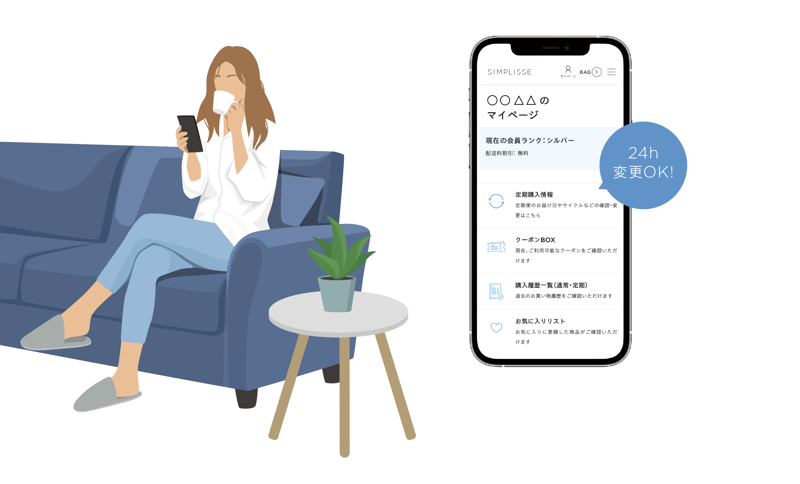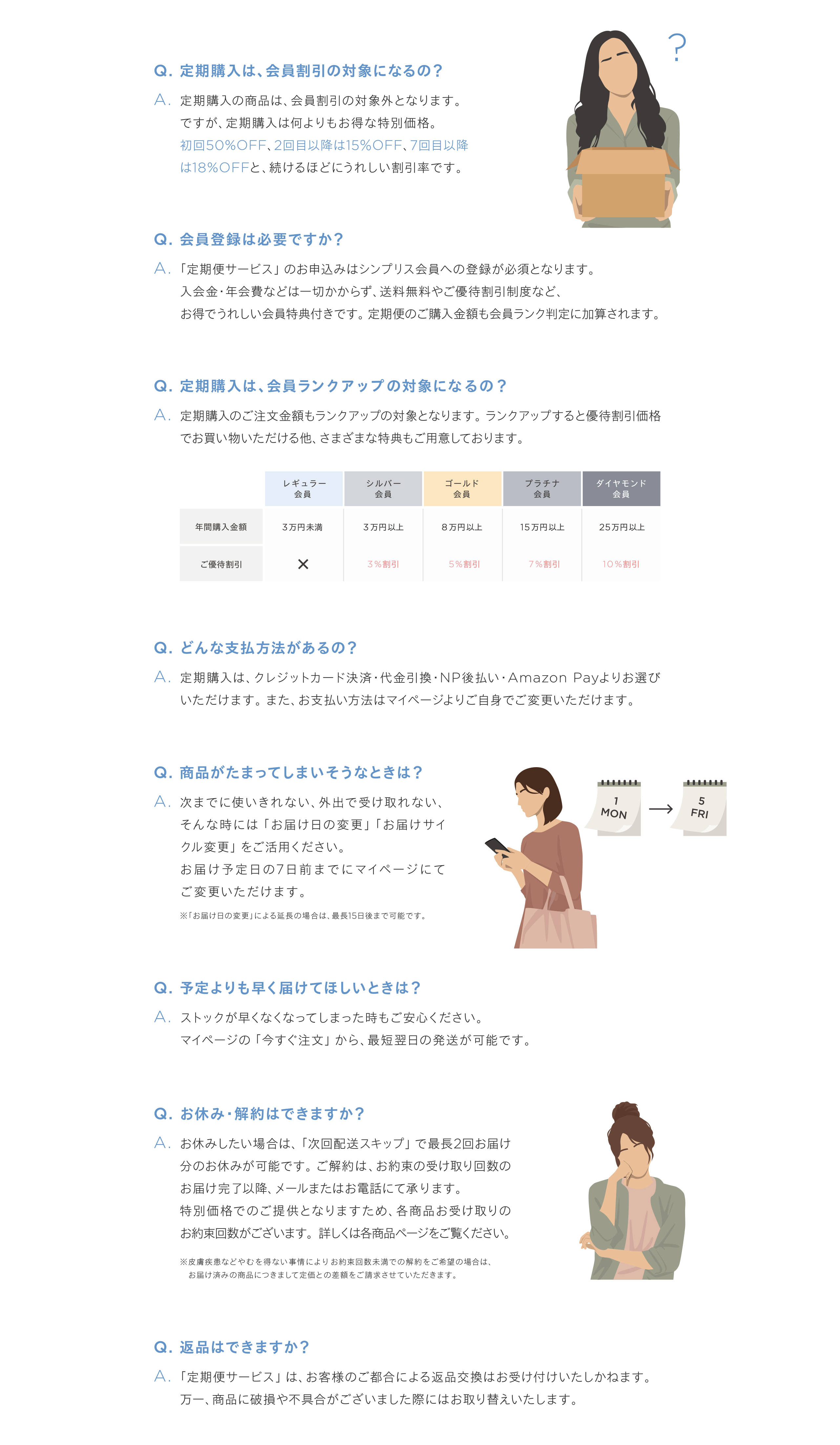 ■ お届け日の変更:マイページ内「定期購入情報詳細」にて、定期購入設定の「次回配送日変更」から定期便のお届け日をご変更いただけます。※次回お届け予定日の15日後までご変更可能。