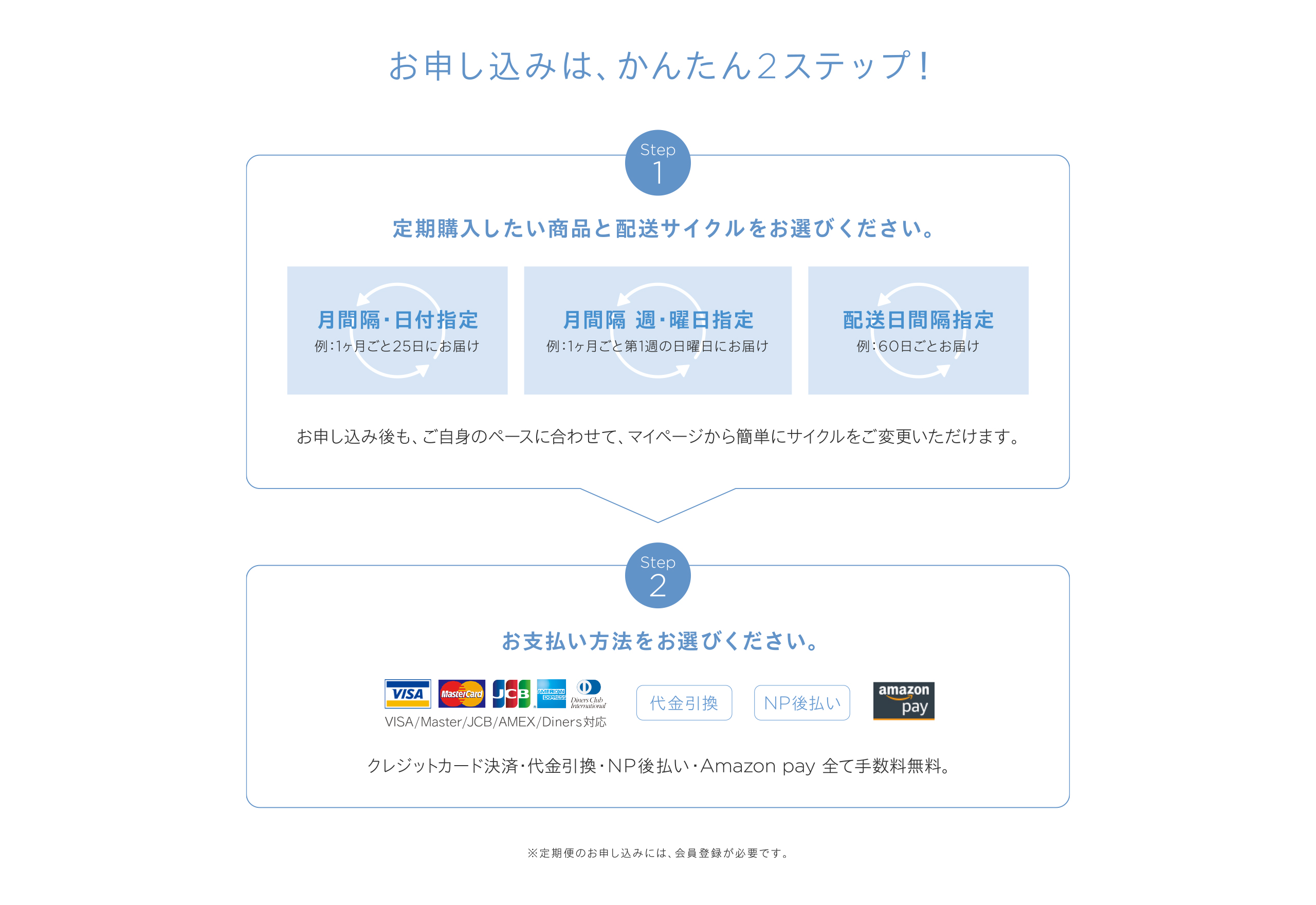 ■ お届けサイクル変更:マイページ内「定期購入情報詳細」にて、定期購入設定の「サイクル変更」から定期便のお届けサイクルをご変更いただけます。