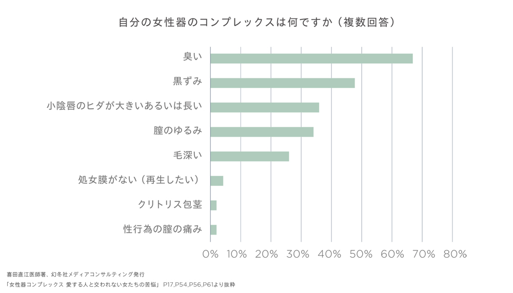 今回、セクシャルヘルスのプロダクト開発に取り組むにあたり、独自にリサーチを行い、また専門医にご意見を伺ったところ、女性のデリケートゾーンの悩みは“ニオイ”が圧倒的に多いことがわかりました(データ参照)。