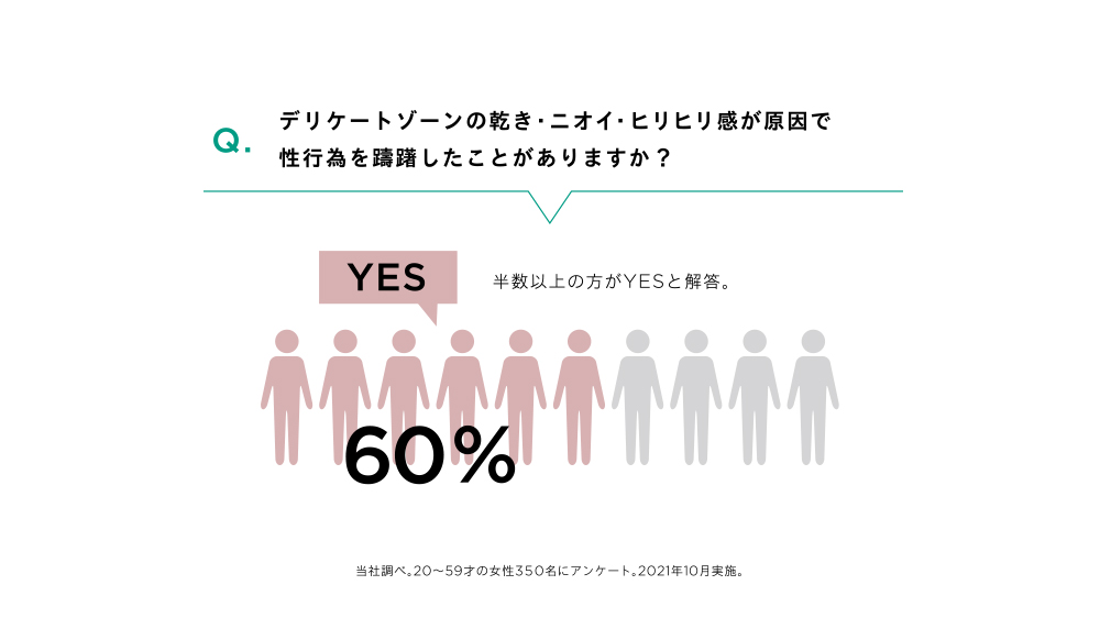 政井:もうひとつのアンケートでは「デリケートゾーンの乾燥やニオイ・ヒリヒリ感が原因で、性行為をちゅうちょしたことがありますか?」という問いに、実に6割の方が「ある」と回答しています。これは若年層も含めた幅広い年齢層の方に聞いた結果ですが、みなさんデリケートゾーンの悩みが原因で、性生活に消極的になっていたのです。