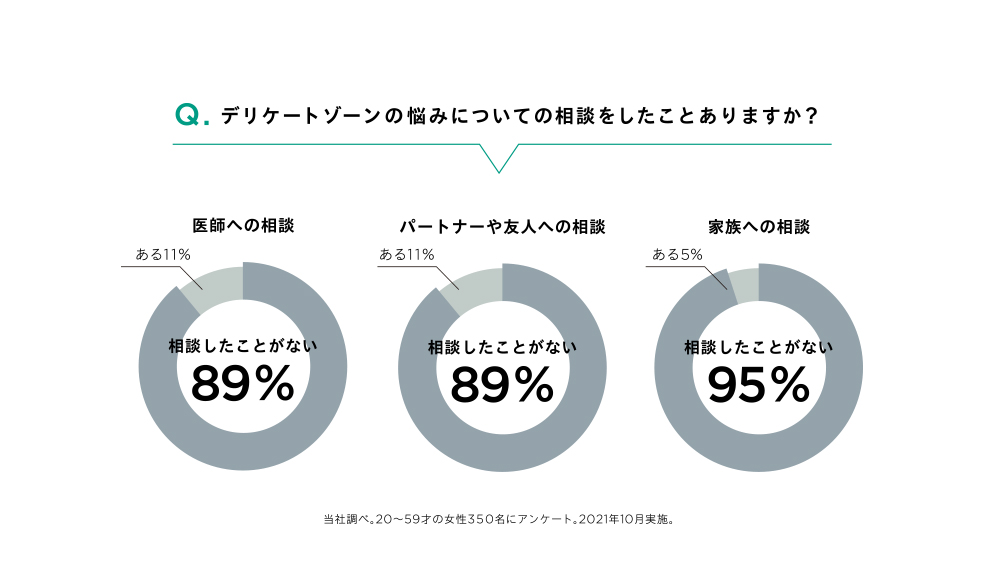 政井年齢で区切って考えてしまうのは、本当にもったいないと思います。実は、もう一つ興味深いアンケート結果があります。「デリケートゾーンの悩みを、医師や家族・友人に相談したことがありますか?」の問いに、9割の方は「ない」と回答されていました。